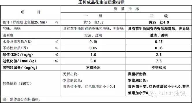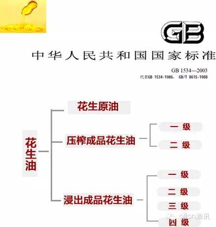 花生油的国家标准GB/T1534-2003将花生油分为花生原油和压榨成品花生油、浸出成品花生油三类。压榨花生油又分为压榨一级和压榨二级,浸出花生油划分为浸出一级至四级。