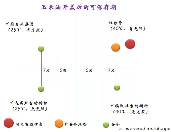 对于玉米油,对光和温度的耐受情况是好的。只有在40℃光照的极端情况下,过氧化值在使用6周后才超标,相比于其他植物油比较稳定。