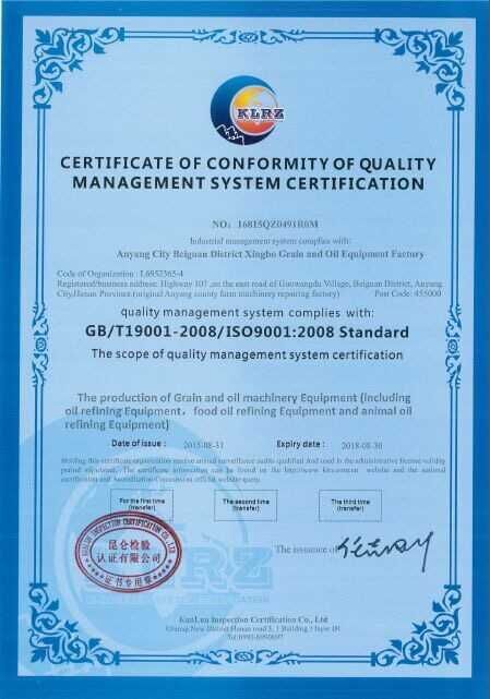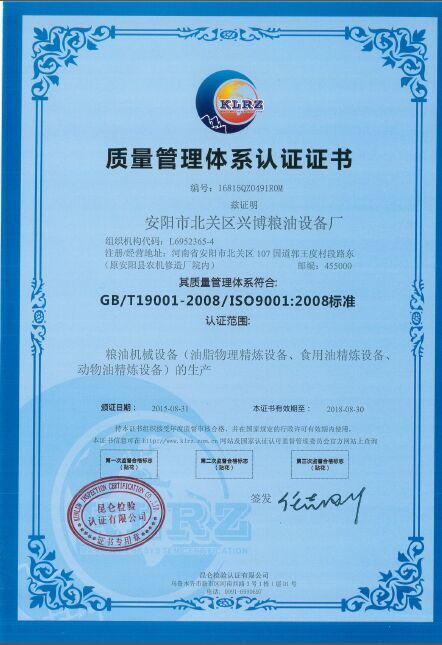 热烈祝贺安阳市北关区江南APP体育 - 中国(官方网站)一站式服务登陆官网 厂通过ISO90001国际质量管理认证;同时也是河南省以生产油脂物理精炼设备、食用油精炼设备、动物油精炼设备厂家通过验证的单位。